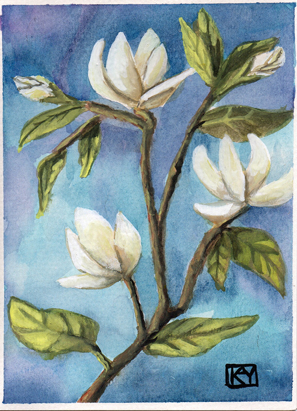 This original watercolor captures the soft unfolding of magnolia blooms along a slender branch, set against a wash of gentle blue. Each petal is painted with a light, delicate touch, allowing the natural grace of the magnolia to shine through—unhurried, luminous, and serene.